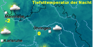 In der Frühe gebietsweise Glätte durch Reif oder überfrierende Nässe. Am Montagvormittag sind im Norden und Osten des Landes noch dichtere Wolken unterwegs, Nebel und Hochnebel lösen sich allmählich auf. Ansonsten ist es freundlich mit Sonnenschein und einigen lockeren Wolken. Die Tageshöchsttemperatur liegt zwischen 0 Grad im Bergland und 4 Grad in der Kurpfalz. Der Wind weht schwach aus Südwest. In der Nacht zum Dienstag ist es meist gering bewölkt und trocken, gebietsweise bildet sich gefrierender Nebel. Die Temperatur geht auf Werte zwischen -4 Grad im Kraichgau und -12 Grad in Oberschwaben zurück.