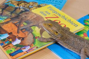 Der Bundesweite Vorlesetag findet seit 2004 einmal im Jahr statt und gilt heute als das größte Vorlesefest Deutschlands, Im Rahmen dessen werden im Heidelberger Zoo wieder bunte und abwechslungsreiche Tiergeschichten zum Besten gegeben: z.B. vom Faultier, das Klavier spielen kann, vom Elefanten mit Sparschwein und vom Känguru, das in einer Socke wohnt. Selbst bei ungemütlichem Novemberwetter lohnt sich ein Zoobesuch, denn die Vorlese-Stationen befinden sich in den warmen Tierhäusern und in der Zooschule. Auch die Zooschul-Bartagame Bert (s. Foto!) wird dabei sein, denn er mag am liebsten die Geschichte von „Fräulein Strohbesen“. Welches Tier sich dahinter verbirgt, erfahren kleine und große Zoobesucher beim Vorlesetag im Zoo.