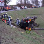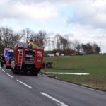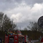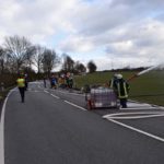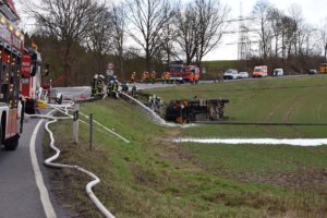 Waibstadt/B 292 (ots) – Nach einem Verkehrsunfall mit Beteiligung eines Tankfahrzeugs am Mittwochmorgen zwischen Helmstadt und Waibstadt ist derzeit die B 292 auf dieser Strecke in beide Richtungen voll gesperrt. Ein 21-jähriger Soldat war gegen elf Uhr mit einem Tankfahrzeug der US-Armee auf der B 292 von Waibstadt in Richtung Helmstadt unterwegs. In Höhe Bernau, kurz nach der Eisenbahnbrücke, kam er aus bislang unbekannten Gründen von der Fahrbahn ab und fuhr die Böschung hinab. Dabei stieß er mit einem Strommasten zusammen und beschädigte ihn so stark, dass die Leitungen rissen und auf die Fahrbahn fielen. Der Lastwagen kippte auf die Seite und kam schließlich zum Stillstand. Dabei schlug der Tankaufbau leck und ein Teil der Ladung, hochexplosives Kerosin, lief aus dem Tank. Zudem wurde der Treibstofftank beschädigt, so dass auch Diesel auslief. Die Unfallstelle wurde weiträumig abgesperrt, ein Sicherheitsbereich von mindestens 50 m rund um die Unfallstelle wurde durch die Feuerwehr festgelegt. Durch den Stromversorger wurden die Stromleitungen vom Netz genommen.