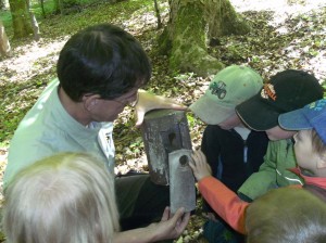 Auf unserem weiteren Weg begegnen uns unsere im Frühling mit dem Förster aufgehängte Nistkästen – im Herbst werden wir diese mit dem Förster zusammen öffnen, die Nester begutachten, erfahren, welche Tiere darin gewohnt haben und den Kasten reinigen.