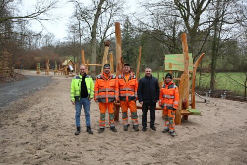 (Stadt Sinsheim): Umgesetzt wurde der neue Spielplatz von städtischen Mitarbeitenden, hier mit Oberbürgermeister Jörg Albrecht (2.v.r.).
