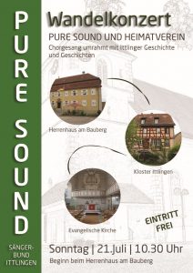 Unter dem Motto: Pure Sound und Heimatverein, Chorgesang, begleitete von Ittlinger Geschichte und Geschichten präsentiert sich der Chor mit Liedgut, von modern bis zum Volkslied, begleitet durch Geschichten und Wissenswertes durch den Heimatverein Ittlingen.