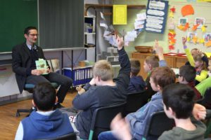 Am Ende des Kapitels klappt der Abgeordnete das Buch zu und sagt: „Das bekommt ihr für die Schulbücherei, da kann dann jeder selbst lesen, wie es mit dem Mammut weitergeht.“ Auch einen Stapel Landtagsbroschüren lässt er den Viertklässlern da.