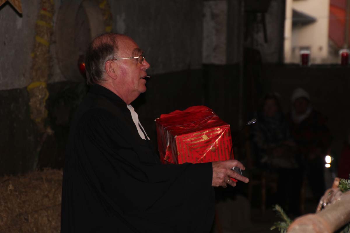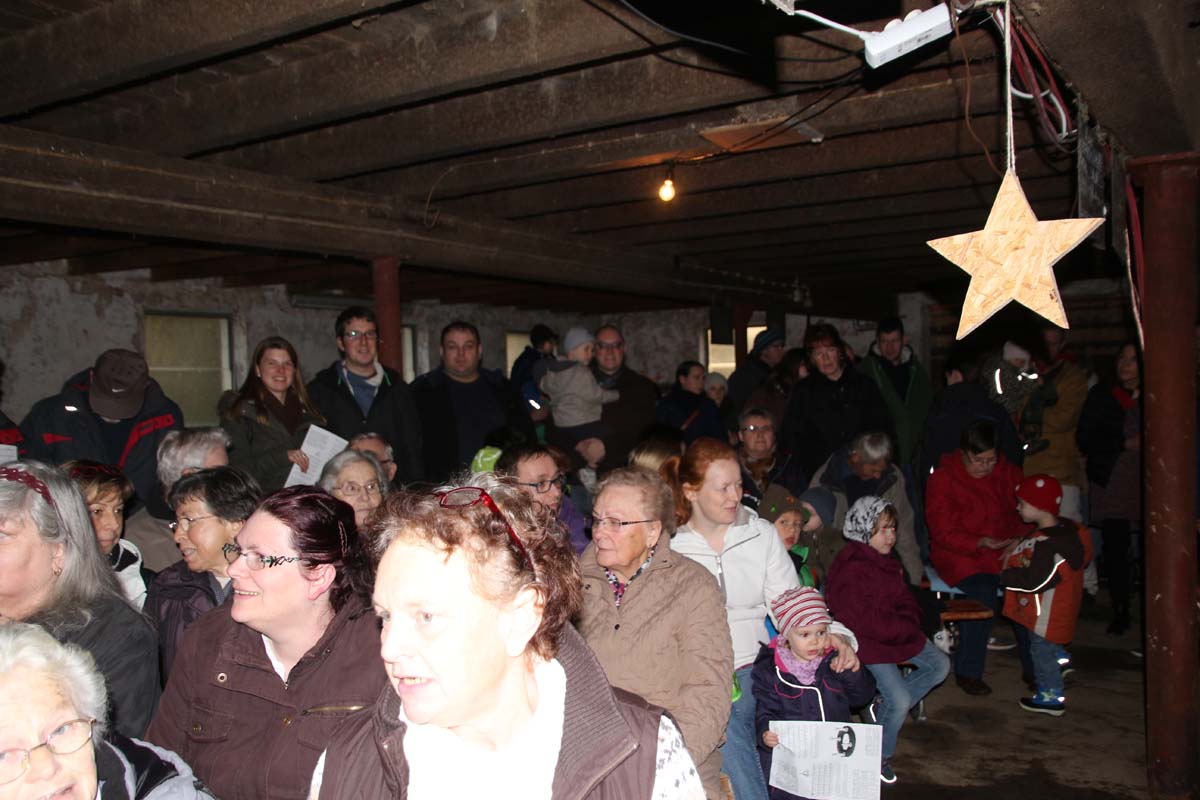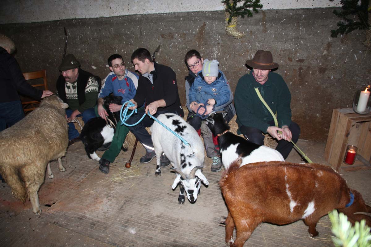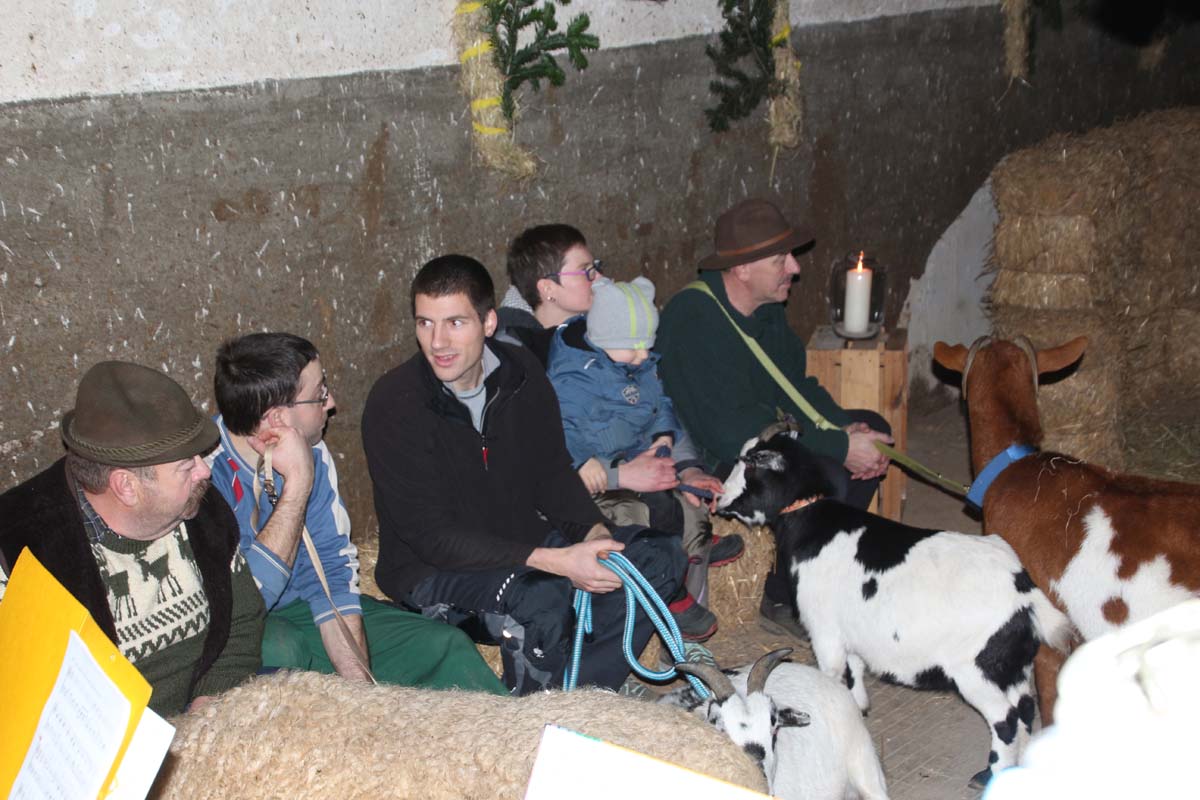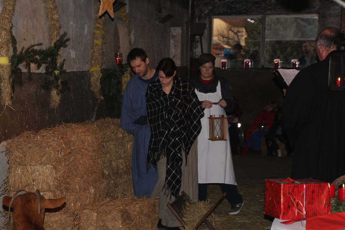 IMG_7006(cr) Bis auf den letzten Platz gefüllt war der Stall beim Bauern Uhler in Reihen. Dieses Jahr fand die traditionelle Stallweihnacht mit der Aufführung der Weihnachtsgeschichte wieder im Stall statt. Zwischen Schaf und Ziege hat auch das Christkind mit Maria und Josef wieder ein trockenes Plätzchen gefunden. Pfarrer Erhard Schulz hatte wieder alles bestens in Szene gesetzt. Dazu ist diese Geschichte aktueller denn je. Denn viele Flüchtlinge haben dieses Jahr bei uns Schutz gesucht und waren zum Glück auch von vielen Bürgern willkommen geheisen. Doch leider gibt es auch andere, aber lassen wir an dieser Stelle diese Geschichte und seine Fortsetzung an Weihnachten ruhen.