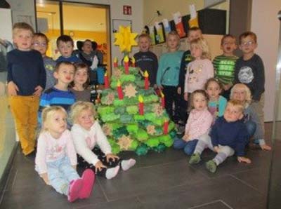 Es ist kein herkömmlicher Tannenbaum, der bald seine Nadeln verliert. Es ist ein Baum, der aus einem Alltagsgegenstand entstanden ist. Unser kreativer Weihnachtbaum wurde aus ca. 150 leeren Eierschachteln kreiert. Alle Schachteln wurden in mühevoller Arbeit von den Kindern grün bemalt und mit gebastelten Sternen und Kerzen geschmückt.