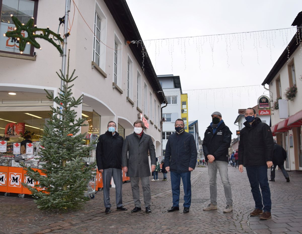 (Stadt Sinsheim): An drei Zugängen zur Innenstadt sorgen künftig neue doppelreihige Überspannungen für weihnachtliche Stimmung v.l.n.r.: Dezernatsleiter Ulrich Landwehr, Dr. Thorsten Seeker (Vorsitzender Wirtschaftsforum Sinsheim), Oberbürgermeister Jörg Albrecht, Michael Jerabek (Stadt Sinsheim); Dezernatsleiter Tobias Schutz