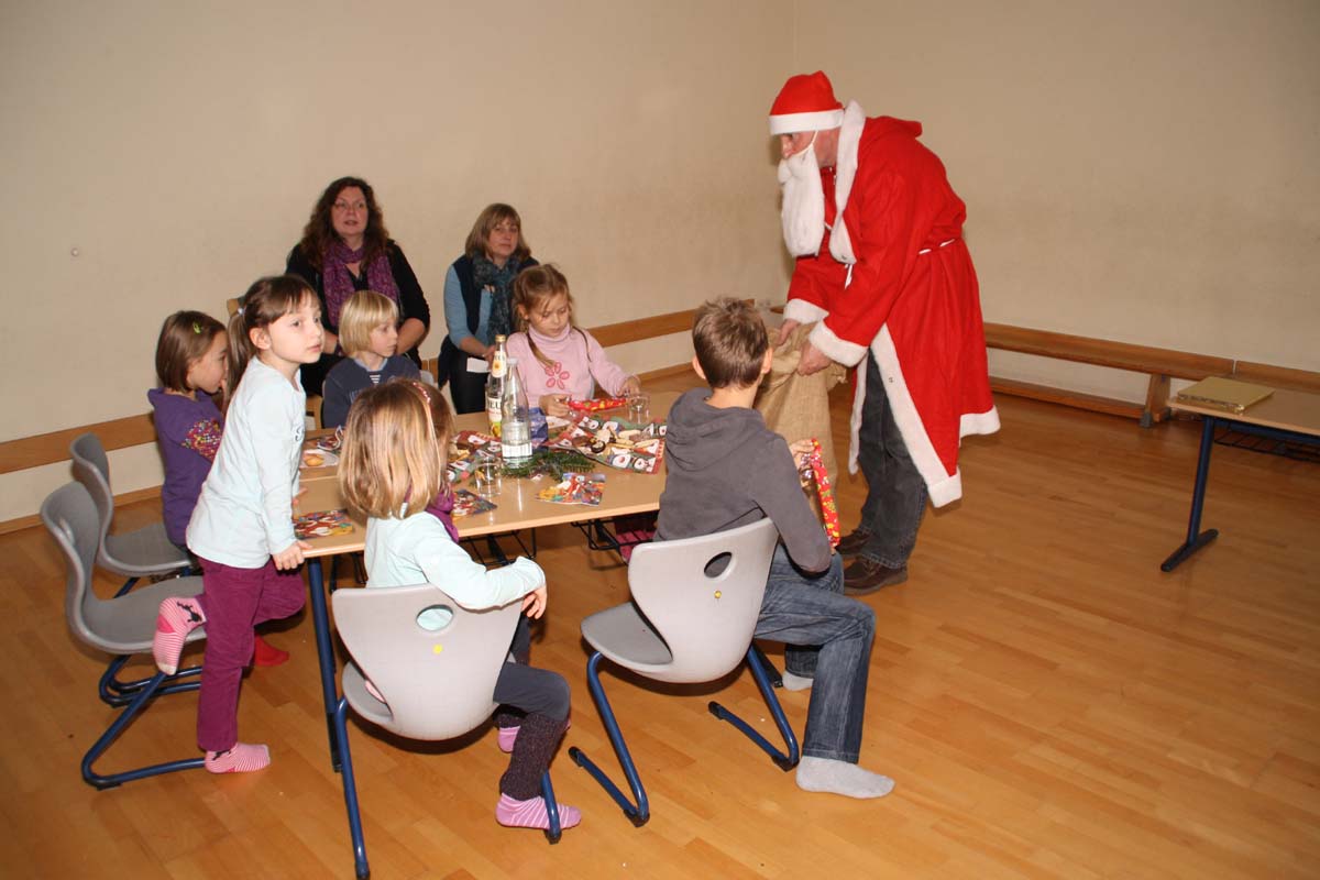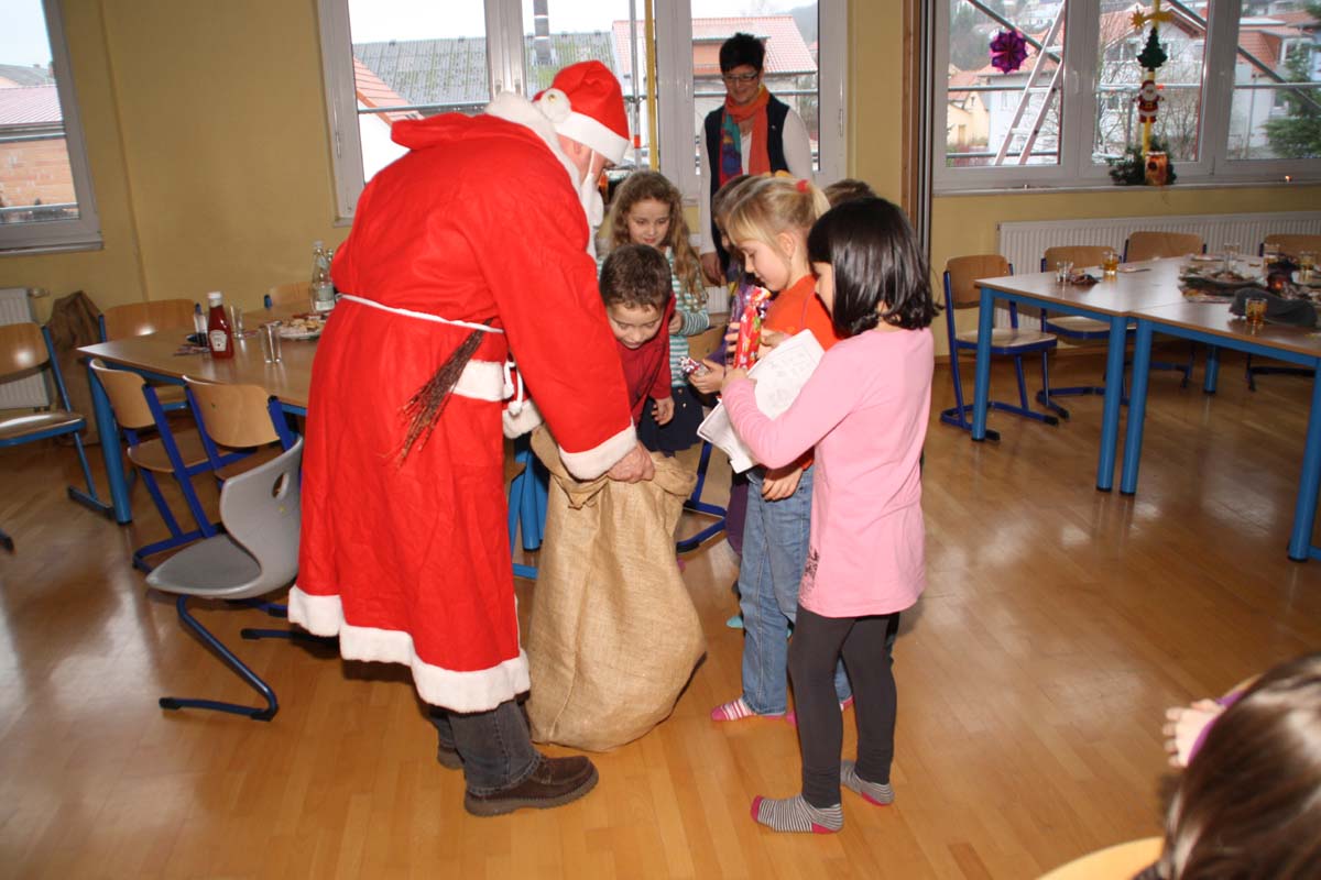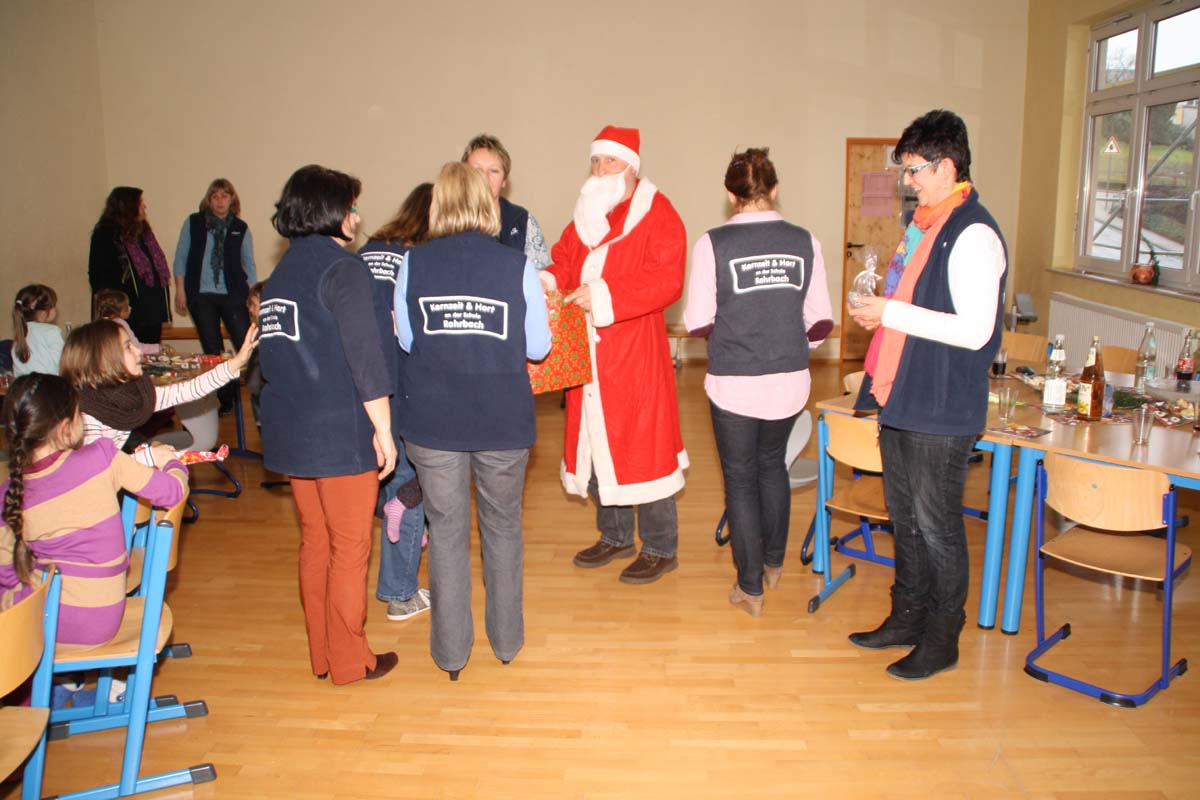 (cr) Weihnachtszeit ist die schönste Zeit, so auch bei der Kernzeit und Hort an der Schule Rohrbach. Gerdi Eiermann, die 1. Vorständin hatte sich wieder richtig was für die Kinder einfallen lassen. Normalerweise sind es 40 Kinder die das ganze Jahr von ihr, den Erzieherinnen und Betreuerinnen versorgt werden. Doch an Weihnachten ist die ganze Grundschule mit eingeladen. Leider waren einige Kinder krank, sonst wären es 83 Kinder gewesen. Angefangen wurde mit einem Mittagessen, heisse Würstchen und Brötchen, dazu natürlich Getränke, später gab es noch selbstgebackene Weihnachtsplätzchen für alle. Nachdem die hungrigen Mäuler alle versorgt waren wurde eine wunderschöne Weihnachtsgeschichte mit Pippi Langstrumpf vorgelesen und in Bilder gezeigt. Auch der Nikolaus wurde mit einem Lied herbeigesungen. Für ihn hatten sich die Kinder natürlich was besonderes einfallen lassen. Fünf Kinder spielten mit Blockflöten, Bongos und Gesang Weihnachtslieder für ihn. Auch zwei Gedichte wurden vorgetragen. Dafür hatte der Nikolaus für jedes Kind ein Geschenk in seinem Sack. Auch an die Betreuerinnen hatte der gute Mann gedacht. Der „Staatsmann“ von Sinsheim OB Jörg Albrecht schaute ebenfalls für ein halbes Stündchen bei der Kinderfeier vorbei. Zwei Mädchen gaben noch einen tollen Auftritt mit ihren Querflöten zum Besten, bevor der Nikolaus mit „Lasst uns froh und munter sein“ wieder verabschiedet werden musste.