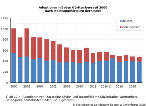 Nach Feststellung des Statistischen Landesamtes wurden im Jahr 2019 von Trägern der Kinder- und Jugendhilfe mit Sitz in Baden-Württemberg 475 Adoptionen vorgenommen (237 Jungen und 238 Mädchen), damit wurde ein neues Rekordtief erreicht (-2 % im Vergleich zum Vorjahr).