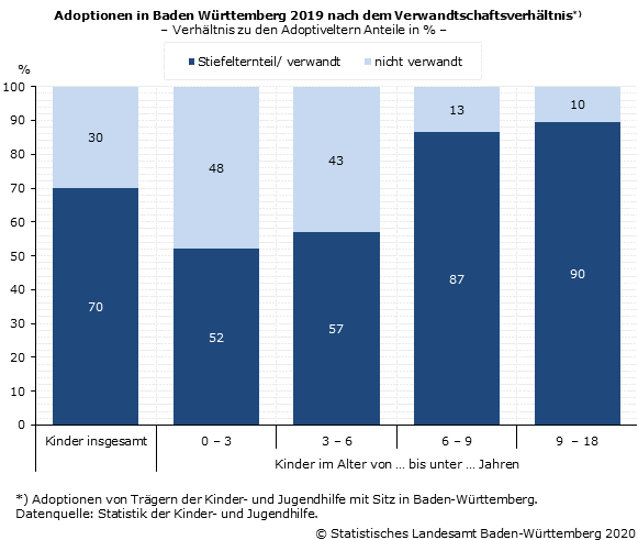 70 % der Adoptionen von den Adoptionsvermittlungsstellen in Baden-Württemberg erfolgten 2019 durch die Partnerin oder den Partner des leiblichen Elternteils (312) oder durch eine, mit dem Adoptivkind verwandte Person (20).
