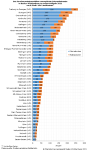 Innerhalb der Stadt- und Landkreise Baden-Württembergs verzeichnete der Stadtkreis Freiburg im Breisgau trotz rückläufiger Unfallzahlen erneut die meisten verunglückten Fahrradfahrenden mit 263 Personen. Darauf folgten der Stadtkreis Stuttgart (231 Verunglückte) sowie der Ortenaukreis (210 Verunglückte). In einer getrennten Betrachtung nach Fahrrädern mit und ohne Elektromotor verunglückten die meisten Nutzerinnen und Nutzer von Fahrrädern ohne Elektromotor im Stadtkreis Freiburg (225 Personen), wohingegen die meisten Nutzerinnen und Nutzer von Pedelecs im Stadtkreis Stuttgart verunglückten (68 Personen).
