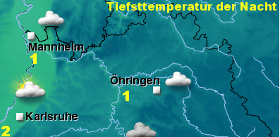Am Sonntag bleibt es überwiegend stark bewölkt, ab und an zeigt sich nach Westen hin auch mal die Sonne. Im Osten fällt örtlich noch leicht Schnee. Die Höchstwerte erreichen örtlich bis 6 Grad am Oberrhein. Der schwache bis mäßige Westwind lebt im Bergland und im Nordosten zeitweise stark böig auf.In der Nacht zu Montag wird teils starke Bewölkung erwartet, vor allem im Westen und Süden können die Wolken auflockern. Dann bildet sich streckenweise gefrierender Nebel. Es bleibt trocken. Die Tiefstwerte liegen zwischen -1 Grad in der Kurpfalz und bis -8 Grad im Bergland. Es besteht Glättegefahr.