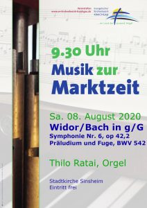 Stadtkirche Sinsheim, Musik zur Marktzeit am 08. August 2020 um 9.30 Uhr (Um 11 Uhr nichts statt).