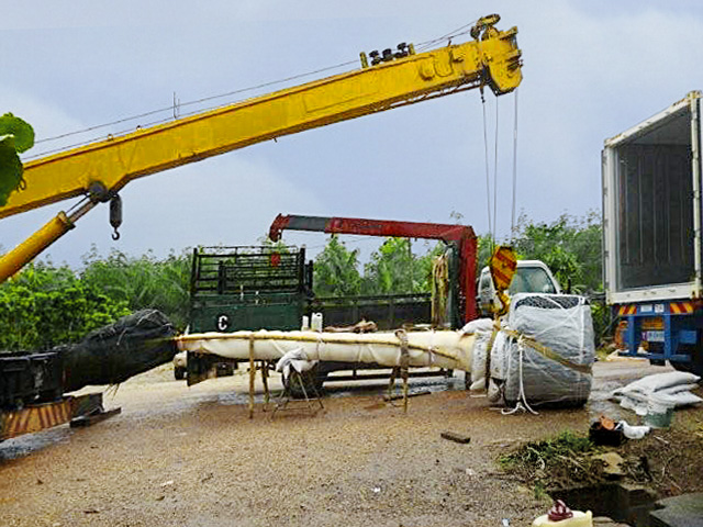 Die bis zu 2,5 Tonnen schweren Pflanzen werden dann mit Spezialkränen durch das geöffnete Dach in die dafür vorgesehenen Pflanzenkübel gesetzt, wo sie für ein einmaliges Urlaubsfeeling und unvergessliche Stunden im Paradies sorgen werden.