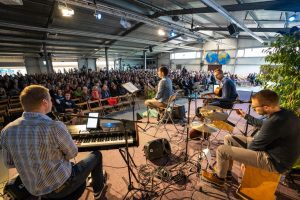 Musikalisch sanft und klangvoll umrahmt wurde das Frühlingsmissionsfest von Simon Georg und Band. Der Leiter der DMG-Öffentlichkeitsarbeit und seine Freunde spielten überzeugend feinfühlige Gitarren- und Klavierklänge, der Gesang von Tabea Falter berührte die Seele. 70 Kinder erlebten ihr eigenes fröhliches Programm mit kids-team; Missionare inspirierten mit Blackbox 40 Jugendliche; die Spielstraße und Piratenschiff-Hüpfburg waren rege genutzt. Jung und Alt aus ganz Deutschland genossen bei schönstem Maiwetter Gemeinschaft mit rund 100 von 400 DMG-Mitarbeitern weltweit.