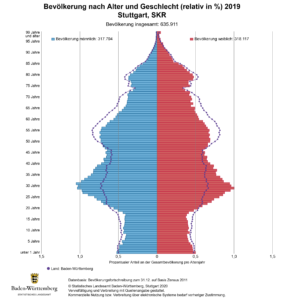 Das Statistische Landesamt Baden-Württemberg hat das interaktive Angebot der Bevölkerungspyramiden mit den Bevölkerungszahlen des Jahres 2019 aktualisiert. Ab sofort kann die aktuelle Altersstruktur für jede Gemeinde Baden-Württembergs abgerufen werden. Dadurch wird auf einen Blick sichtbar, wie die Bevölkerung einer Gemeinde zusammengesetzt ist: Gibt es viele junge oder mehr ältere Einwohnerinnen und Einwohner? Ist ein starker Überhang an jungen Erwachsenen sichtbar, oder »fehlt« in der Gemeinde diese Generation? Leben mehr Frauen oder Männer in der jeweiligen Kommune? Durch einen Zeitregler kann die Veränderung der Altersstruktur im Verlauf der Zeit dargestellt werden. Dadurch wird der fortschreitende demografische Wandel, bei dem die Babyboomer-Generation der heute 50- bis 65-Jährigen in das Rentenalter fortschreiten, sichtbar.