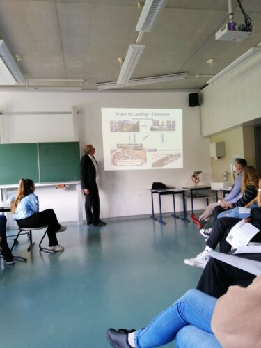 Im Anschluss war Schütte für eine Doppelstunde in der 12. Klasse zu Gast. Im Rahmen einer kurzweiligen Präsentation berichtete er den Schülerinnen und Schülern über seinen politischen Alltag und ging auf die Frage ein, wie man eigentlich Abgeordneter wird und wie eine Arbeitswoche in dessen Leben aussieht. Ausgehend von beruflichen und politischen Erfahrungen sowie seinem Ehrenamt, stellte Schütte seine Arbeit im Landtag, in den Ausschüssen und im Wahlkreis vor. „Politik findet auf verschiedenen Ebenen statt; jede und jeder kann sich daran beteiligen, auch junge Menschen. Besonders auf kommunaler Ebene kann man sich frühzeitig in politische Willensbildungsprozesse einbringen und erste politische Erfahrungen sammeln. Die Situation der vergangenen Jahre hat gezeigt, dass Demokratie einen starken Nachwuchs braucht“, so Schütte.