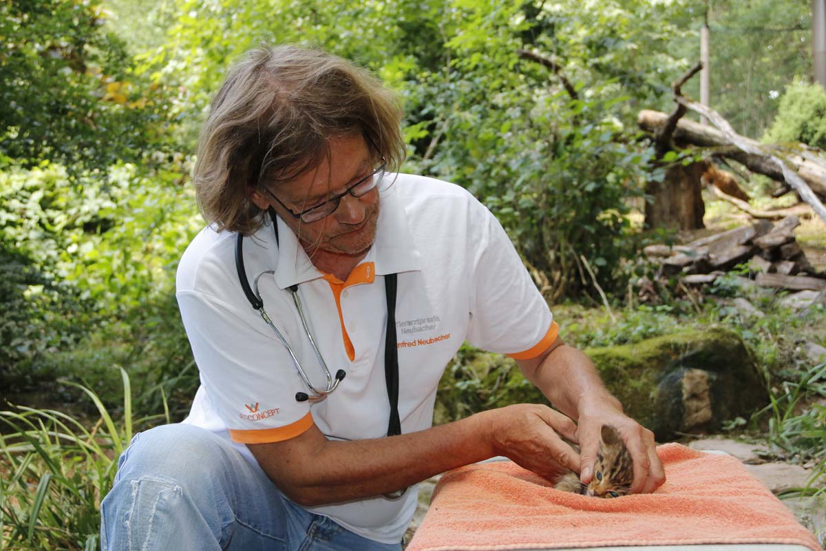 Am Freitag, dem 16.6.2017, hatte der Nachwuchs seinen ersten Arzttermin: Der betreuende Tierarzt kam eigens nach Tripsdrill, um den Kätzchen ihren „Personalausweis“ auszustellen. Bei diesem handelt es sich um einen winzigen Chip, mit dem jede der Katzen von nun an individuell identifizierbar ist. Das „Chippen“ gilt in Fachkreisen als die schonendste Methode, um Jungtiere zu markieren. Der Tierarzt nutzte die Gelegenheit, um eine allgemeine Gesundheitskontrolle vorzunehmen, die Katzen-Babys zu impfen und ihr Geschlecht zu bestimmen. Die Kontrolle ergab: Tripsdrill kann sich über zwei kerngesunde Katzen-Jungen und ein ebenso quicklebendiges Katzen-Mädchen freuen.