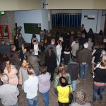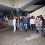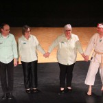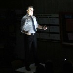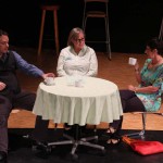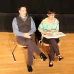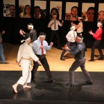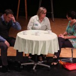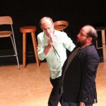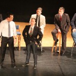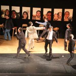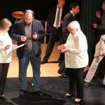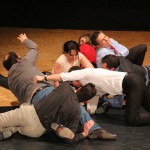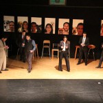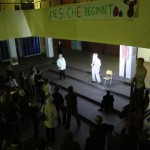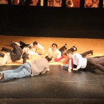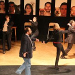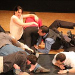 IMG_0442(cr) Hervorragend umgesetzt wurde das Stück Top Dogs von Urs Widmer, von dem Lehrerensemble des Wilhelmi Gymnasium Sinsheim. Dieses Stück beschäftigt sich nut gekündigten Topmanagern die mit Hilfe der New Challenge Company versuchen ihr Berufs- und Privatleben wieder in den Griff zu bekommen und möglichst schnell wieder im Beruf Fuss zu fassen. So grotesk die ganze Vorgehensweise gezeigt wird, so nah ist es doch an der Realität. Nach der Pause wurde das Stück für kurze Zeit vom Musiksaal in den Lichthof verlegt, die Zuschauer wurden hier direkt in das Stück mit einbezogen.