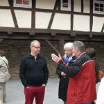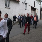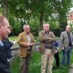 (zg) Ortsvorsteher Rüdiger Pyck begrüßte im Hof des Lerchennests die interessierten Bürgerinnen und Bürger und bedankte sich beim Verein für die Bewirtung. Oberbürgermeister Albrecht begrüßte die stattliche Zahl der Interessierten am Ortsrundgang zu den Schwerpunkten der Ortssanierung in Steinsfurt und erläuterte die Grundzüge der geplanten Maßnahmen. Da bei den privaten Grundstücken im Sanierungsgebiet in vielen Fällen .noch Planungs- und Beratungsbedarf bestehe, wird die Stadt in enger Zusammenarbeit mit dem Ortschaftsrat mit Maßhahmen an den stadteigenen Objekten beginnen: als Startsschuss und auch um Anreize für die privaten Investoren zu schaffen. . So wird die Verwaltungsstelle einer gründlichen Überarbeitung unterzogen. Herr Hecker, der in regelmäßigen Abständen in Steinsfurt weilt und die interessierten Eigentümer in Einzelgesprächen berät, verwies auf den Zweck der Ortssanierung, die Möglichkeit zu schaffen, nicht mehr genutzte Gebäude abzureißen, den Wohnwert manch älterer Gebäude durch geförderte Maßnahmen zu verbessern und die Schaffung von neuem Wohnraum und einer verbesserten Struktur zu schaffen. Die Maßnahme ist auf 8 Jahre angelegt. Oberbürgermeister Albrecht gab seiner Hoffnung Ausdruck, eine Verlängerung des Maßnahmezeitraums und eine Aufstockung der Fördergelder zu erreichen. Nach einem geselligen Umtrung im Museumshof wurde der ersten Station zugestrebt: dem Gebäude mit dem Steinsfurter Jugendzentrum und Lagerraum der städtischen Arbeiter in Steinsfurt. Im rückwärtigen Bereich befindet sich ein großes Areal mit alten und teilweise schon abgebrochenen Gebäuden in Privatbesitz. Hier laufen die Verhandlungen schon, so der Oberbürgermeister, um alle Gebäude abzubrechen und einem Großinvestor anzudienen, betreutes Wohnen wär der Ortsverwaltung sehr willkommen. Ein Rundblick über die Straße fiel auf zwei private Gebäude, deren Eigentümmer an eine grundlegen Sanierung, zusätzlich auch an einem Neubau interessiert sind. Herr Hecker warb aber um Vertständnis, dass er aus datenschutzrechtlichen Gründen zu privaten Maßnahmen keine Auskunft geben kann. Beispielhaft für die Tiefe und Auswirkungen der Sanierung war der nächste Halt im Ansbach. Der Park – malerisch von den beiden Elsenzarmen umspült – soll für neue Nutzungen tauglich gemacht werden. Bürger, die vor Jahren schon engagiert bei der Umgestaltung dabei waren, brachten ihre Erfahrungen und Vorschläge in Erinnerung. Oberbürgermeister Albrecht verwies bei der Neugestaltung darauf hin, dass zuerst wasserrechtliche Genehmigungen eingeholt werden müssen, der Hochwasserschutz auch geprüft werde. Dadurch kann auch ein großer teil der Kosten von anderen Trägern übernommen werden. Wichtigste Station war dann die Verwaltungstelle, da hier die Planung weit fortgeschritten ist und in Trägerschaft der Stadt Sinsheim viele Vorstellungen verwirklicht werden können.
