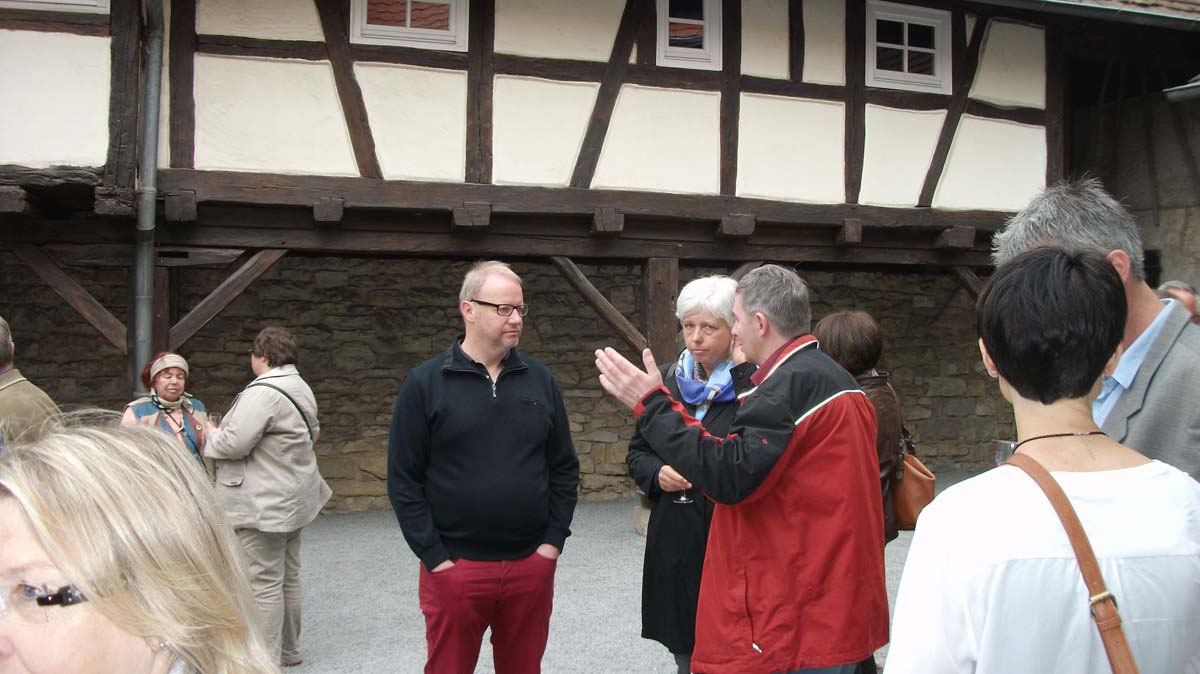 Kurz vor Ende des Rundgangs wurde noch an der ehemaligen Synagoge in der Dickwaldstraße Halt eingelegt, deren Sanierung durch den Verein schon sehr weit fortgeschritten ist. Anschließend konnte bei einem Imbiß im Lerchennesthof das erlebte noch einmal in Ruhe besprochen werden.