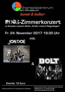 Der volle Erlös dieser Veranstaltung kommt „Kinder unterm Regenbogen“ zu Gute. Zu Gast sind die Heilbronner Rockband BOLT und die Neckargemünder Jungs von „Jon Doe“, die voll und ganz dem alternative Rock verschrieben haben. Nirgendwo ist man der Bühne näher als bei unseren Wohnzimmerkonzerten.