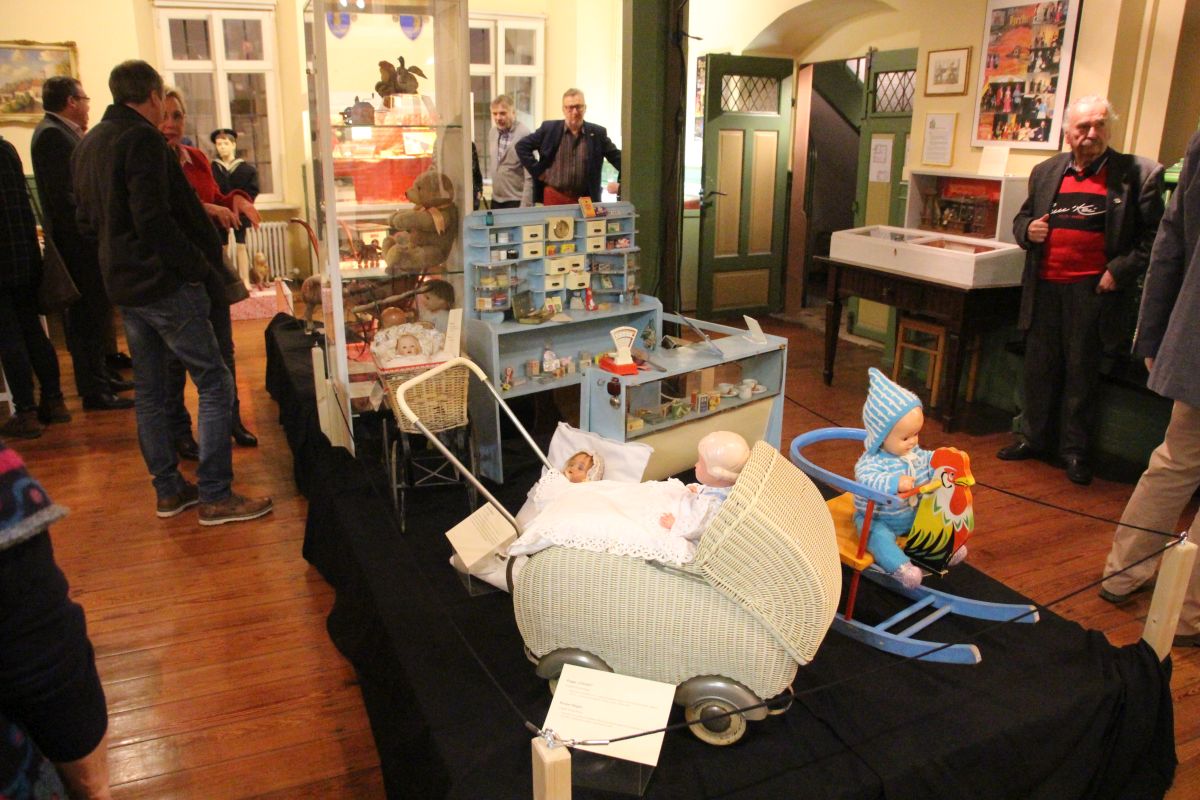 Auch Oberbürgermeister Jörg Albrechts Erinnerungen an ein Steckenpferd und eine Modelleisenbahn wurden geweckt. Bei seinen Grußworten zur Vernissage erwähnte er einige Objekte seiner Kindheit, die er der Ausstellung noch hätte beisteuern können. Museumsleiterin Dinah Rottschäfer gab Einblick in die Entstehungsgeschichte der Ausstellung: Am Anfang stand eine kleine aufziehbare mechanische Blechspielente, die im Depot nur darauf wartete, entdeckt zu werden. Nach und nach förderte das Stadtmuseumsteam immer mehr interessante Spielzeuge zu Tage. Auch Gegenstände der eigenen Kindheit wurden ausgegraben. So hat die Ausstellung auch eine ganz persönliche Note. Und nicht nur das: zahlreiche Leihgeber hörten von der Ausstellung und bereicherten sie mir ihren Objekten.