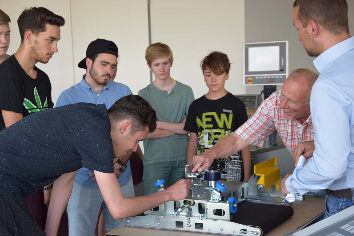 Für die Besucher gab es dabei viel zu erleben: So konnten Demonstrationsanlagen im Showroom „im Einsatz“ begutachtet werden. Danach stand zum Beispiel ein Produktionsrundgang an, um die Prozesse bei der Herstellung von Förder- und Sortieranlagen kennenzulernen. Beim Projekt „Würfel“ konnten die Schüler die Herstellung durch Laserstrahlschneiden einer eloxierten Aluminiumblechtafel beobachten. Im Anschluss durfte selbst Hand angelegt werden, durch manuelles Biegen wurde das Produkt fertiggestellt.
