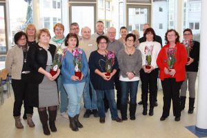 (zg) „Es ist eine starke Leistung, sich in einem solch schwierigen Umfeld so lange zu behaupten.“ So lautete einer der vielen anerkennenden Sätze für insgesamt zwölf Mitarbeiterinnen und Mitarbeiter des GRN-Betreuungszentrums Sinsheim anlässlich ihres 25-jährigen Dienstjubiläums im Öffentlichen Dienst oder ihres Eintritts in den Ruhestand. Ausgesprochen hat ihn Heimleiterin Yvonne Sonnenfroh, die sich ebenso wie die GRN-Betriebsratsvorsitzende Elvira Rudischer-Weckesser, Personalreferentin Charlotte Dick und die jeweiligen unmittelbaren Vorgesetzten für die langjährige Treue zum Unternehmen sowie das Engagement für die Bewohnerinnen und Bewohner des Betreuungszentrums bedankte. Sie alle hatten sich am Donnerstag, 26. Januar 2017, zu einer kleinen Jubiläums- und Abschiedsfeier im Casino des Sinsheimer GRN Gesundheitszentrums versammelt.