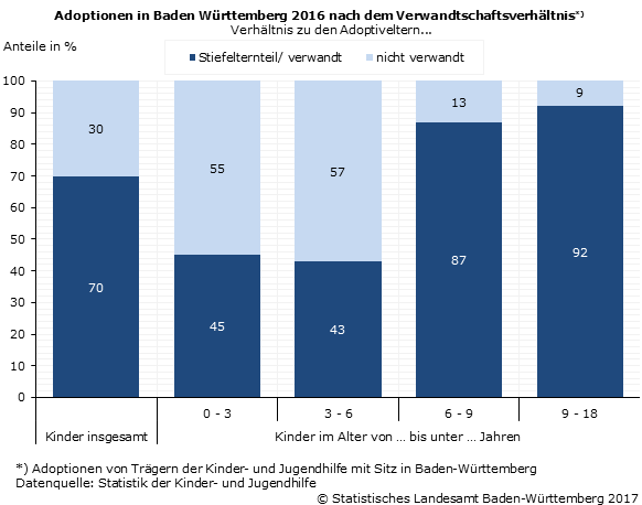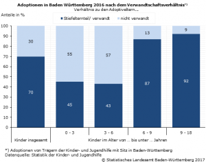 2016 wurden in Baden Württemberg 245 Jungen und 245 Mädchen zur Adoption vermittelt. Knapp ein Drittel der Adoptierten hatte das 3. Lebensjahr noch nicht erreicht, 11 % waren zum Zeitpunkt der Adoption zwischen 3 und unter 6 Jahren alt, weitere 16 % waren im Alter von 6 bis unter 9 Jahren. 41 % der adoptierten Kinder und Jugendlichen war zwischen 9 und 18 Jahre alt.