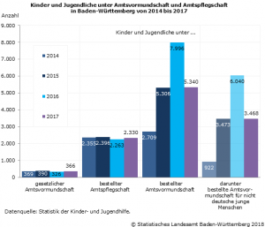 Beim Tod beider Eltern, aber auch bei einem vollständigen Entzug der elterlichen Sorge, einer anonymen Geburt oder bei der Einreise eines minderjährigen unbegleiteten Flüchtlings kann das Familiengericht das Jugendamt als Vormund einsetzen (bestellte Amtsvormundschaft). Dies betraf nach Feststellung des Statistischen Landesamtes im Jahr 2017 insgesamt 5 340 Kinder und Jugendliche in Baden-Württemberg, davon 1 310 Mädchen und 4 030 Jungen1. Damit ist die Zahl der bestellten Amtsvormundschaften gegenüber 2016 (7 996) um 33 % gesunken. Dies ist insbesondere auf die rückläufige Zahl unbegleiteter minderjähriger Ausländerinnen und Ausländer zurückzuführen. Die Zahl der bestellten Amtsvormundschaften für junge Menschen mit ausländischer Nationalität hat sich mit 3 468 im Vergleich zum Vorjahr (6 040) fast halbiert.