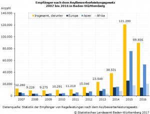 (zg) Am Jahresende 2016 wurden nach Feststellung des Statistischen Landesamtes in Baden‑Württemberg 89 856 Personen mit Regelleistungen zur Deckung des laufenden Lebensunterhaltes nach dem Asylbewerberleistungsgesetz (AsylbLG) unterstützt. Damit ist die Zahl der Empfänger von Asylbewerberleistungen im Vergleich zum Vorjahr (mit 121 280 Personen) um 25,9 %, d.h. um ein Viertel, zurückgegangen.