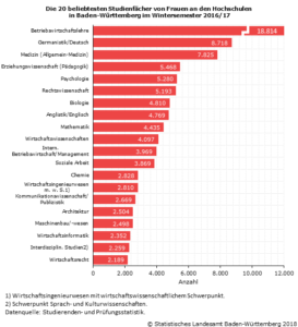Betriebswirtschaftslehre stellte sowohl bei den weiblichen Studierenden (rund 18 800) als auch bei den männlichen Studierenden (gut 17 500) das beliebteste Studienfach dar. In dem Beliebtheitsranking unter den Studentinnen wird das Studienfach Betriebswirtschaftslehre gefolgt von Germanistik/Deutsch (8 700), Medizin (7 800) und Erziehungswissenschaft/Pädagogik (5 500).