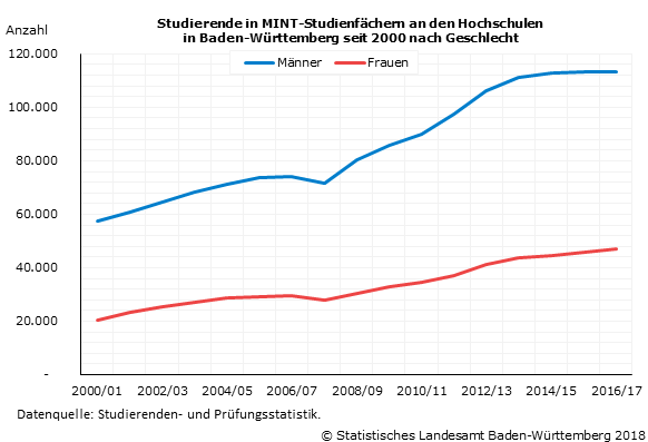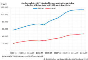 47 % der fast 359 900 Studierenden an baden-württembergischen Hochschulen waren im Wintersemester 2016/17 weiblich. Im Vergleich zum Vorjahr stieg die Anzahl der Studentinnen von knapp 167 400 auf gut 170 400. An den Pädagogischen Hochschulen (Frauenanteil: 78 %), den Hochschulen für Angewandte Wissenschaften der Verwaltung (Frauenanteil: 63 %) sowie den Kunsthochschulen (Frauenanteil: 56 %) überstieg die Anzahl der Studentinnen die Anzahl der Studenten. An den Universitäten entsprach der Frauenanteil mit 47 % genau dem Durchschnitt. An der Dualen Hochschule Baden-Württemberg (43 %) und den Hochschulen für Angewandte Wissenschaften (41 %) war der Frauenanteil unterdurchschnittlich.