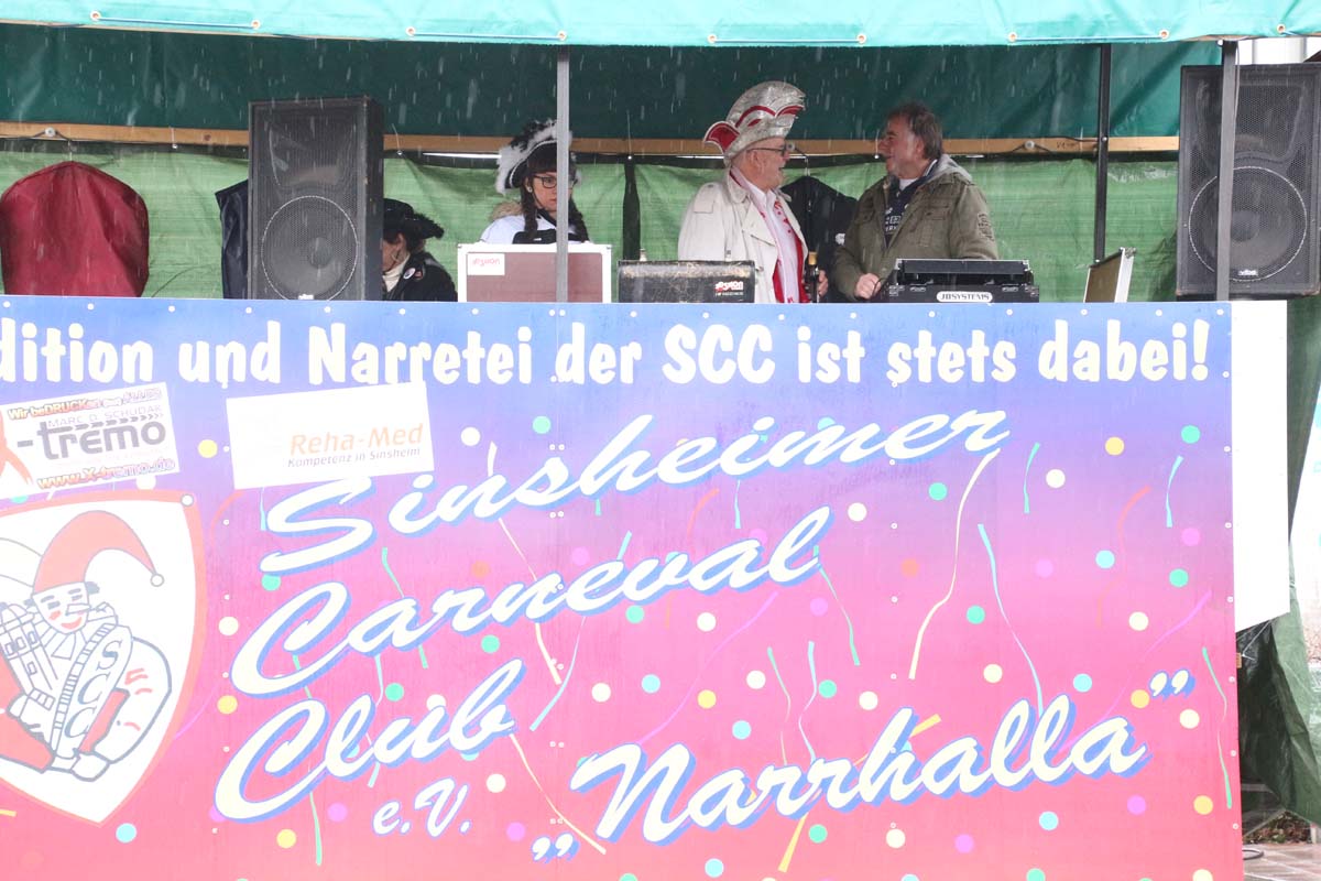 (cr) Schade das der Wettergott am vorletzten Sonntag zum 2. Sinsheimer Strassenfasching kein Einsehen hatte. Ein paar Faschingsnarren fanden den Weg zum Sinheimer Wächter. Doch irgendwie gehört der SCC einfach zur Sinsheimer Faschingskultur und dieser sollte im kommenden Jahr kräftig unterstützt werden. Das haätte sich der SCC und der Sinsheimer Fasching verdient. Trotzdem auf den SCC ein dreifaches Sinse Helau.