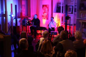 Karl Schramm, Didi Leinberger(zg) Ein gemütlicher Raum, Wohnzimmeratmosphäre und Gastfreundlichkeit liegt in der Luft. Ein gutgelaunter Karl Schramm und eine bezaubernde Didi Leinberger stimmen sich auf das bevorstehende Konzert über Leonard Cohen ein, bevor die Location im Wirths-Haus von den Strömen von Gästen prächtig gefüllt wird.