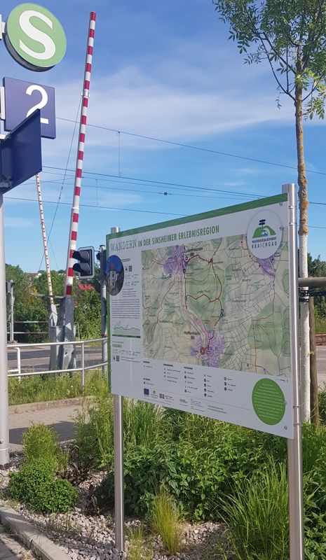 Mit der neuen Beschilderung sind auch die „Wanderbahnhöfe“ in den Fokus gerückt. Die Wanderbahnhöfe Kraichgau sind mit den Bahnen der Linien KVV/AVG, VRN und DB erreichbar. An den Bahnhöfen oder Haltestellen in den Kraichtaler Ortsteilen, in Zuzenhausen, Hoffenheim, Sinsheim, Sulzfeld, Zaisenhausen und Flehingen finden sich nun Infotafeln mit einer Übersichtskarte, interessanten Infos und Tourenvorschlägen für die jeweilige Region. Sie geben den Einstieg in die Entdeckung der Kraichgauer Hügel, Hohlwege und Streuobstwiesen. Auch Hinweise zu Einkehrmöglichkeiten gibt es auf den Schildern. Über die Wanderbahnhöfe soll eine Anreise ohne Auto erleichtert werden und der Wanderer muss sich nicht nur auf Rundwege konzentrieren.