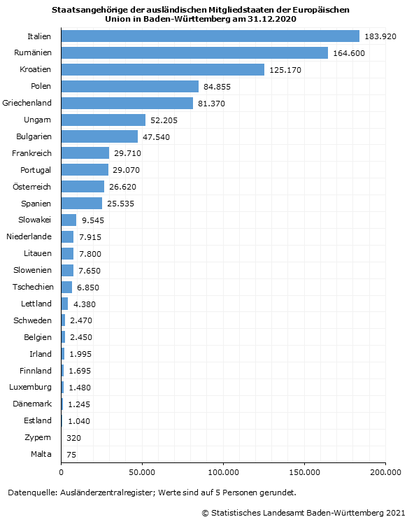 Die größte Bevölkerungsgruppe aus den EU-Mitgliedstaaten bilden in Baden-Württemberg weiterhin Italienerinnen und Italiener (183 900). Es folgen Staatsangehörige aus Rumänien (164 600), aus Kroatien (125 200) und aus Polen (84 900).3 Dagegen sind Staatsangehörige aus Malta und aus Zypern im Südwesten kaum vertreten (Schaubild).