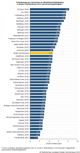 Das größte Angebotsvolumen an Printmedien wiesen die 20 Bibliotheken im Stadtkreis Stuttgart auf. Gut 1,2 Mill. Bände/Medieneinheiten2 wurden im Jahr 2017 zur Verfügung gestellt. Diese wurden mehr als 5,2 Mill. Mal entliehen. Mit rund 8,3 Entleihungen je Einwohnerin und Einwohner war die Entleihungsquote im Stadtkreis Stuttgart etwa drei Mal so groß wie im Hohenlohekreis, wo das geringste Angebotsvolumen (gut 84 000 Bände/Medieneinheiten) vorlag. Trotz des geringen Medienbestands in den Bibliotheken des Hohenlohekreises tätigten die ansässigen Einwohnerin und Einwohner etwa 95 000 Entleihungen mehr als im Landeskreis Freudenstadt, wo die niedrigste Entleihungsquote mit rund 1,7 Entleihungen pro Einwohnerin und Einwohner gemessen wurde. Zu berücksichtigen ist allerdings die Tatsache, dass das Medienangebot eines Kreises auch von Einwohnerinnen und Einwohnern der umliegenden Kreise genutzt werden kann, was wiederum einen Einfluss auf die berechneten Entleihungsquoten ausübt.
