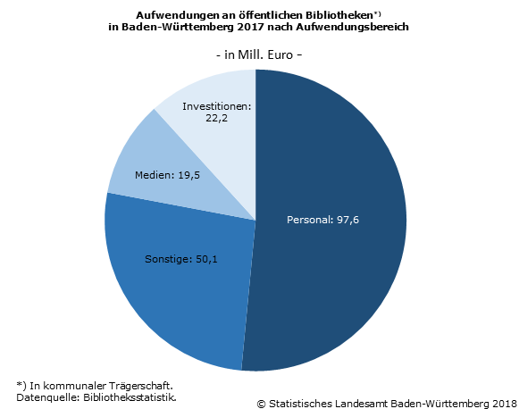 Die Aufwendungen der Bibliotheken zur Erhaltung und Aufstockung des Medienbestands betrugen im Jahr 2017 etwa 19,5 Mill. Euro. Annähernd 97,6 Mill. Euro wurden für die Vergütung der Belegschaft aufgewendet. Darüber hinaus wurden etwas mehr als 22,2 Mill. Euro investiert und knapp 50,1 Mill. Euro für sonstige Zwecke ausgegeben. Insgesamt lagen die Ausgaben im Jahr 2017 bei gut 189 Mill. Euro.